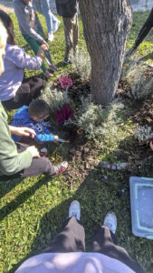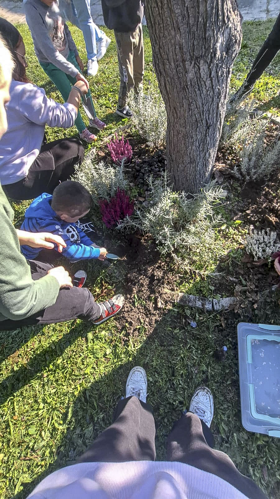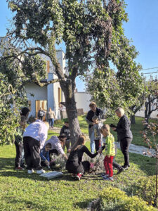 Po rozgrzewce przyszedł czas na naukę przez zabawę. Dzieci dowiedziały się, czym są „zielone płuca szkoły” – czyli specjalnie zagospodarowane przestrzenie z bujną roślinnością, które wspierają przyrodę, zatrzymują wodę, przyciągają ptaki i owady, a do tego upiększają szkolne otoczenie. Te ekologiczne ciekawostki zostały od razu zobaczone i dotknięte w praktyce – w końcu najlepiej uczyć się poprzez doświadczenie.