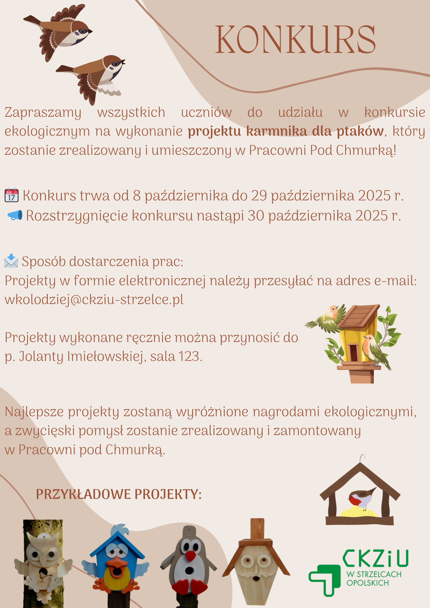 KONKURS EKOLOGICZNY – „Projekt karmnika dla ptaków w Pracowni pod Chmurką” Zapraszamy wszystkich uczniów CKZiU w Strzelcach Opolskich do udziału w konkursie ekologicznym na wykonanie projektu karmnika dla ptaków, który zostanie zrealizowany i zamontowany w naszej Pracowni pod Chmurką! 🌳 Cele konkursu: 🗓️ Termin trwania konkursu: 8 – 29 października 2025 r.📢 Rozstrzygnięcie: 30 października 2025 r. Sposób dostarczenia prac: Wymagania projektu:…