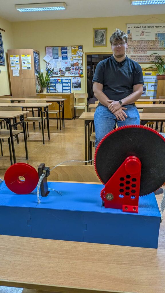 Czym zajmuje się Brajan? Brajan zaprojektował i zbudował urządzenie do odzysku filamentu z plastikowych butelek prawie każdego rodzaju. Elementy konstrukcji urządzenia takie jak: zębatki, obudowy, szpule zostały wydrukowane na drukarce 3D. Urządzenie ma wbudowany silnik, który napędza szpulę a dodatkowo konstrukcja została wyposażona w nóż do cięcia butelki na paski oraz dyszę z grzałką, która odpowiadała za przetopienie plastikowych pasków z pociętej butelki na okrągły filament. Termostad odpowiada za regulowanie temperaturą dyszy, aby plastik się nie przetopił. Wentylator ma chłodzić dysze oraz filament. Cała konstrukcja jest osadzona na profilach aluminiowych, aby wzmocnić i połączyć wszystkie elementy w jedną całość. Maszynka przyczyni się do zmniejszenia odpadów w formie butelek plastikowych, które mogą zostać przekształcone na filament a ten może być wykorzystany do wydruku na drukarce 3D np. potrzebnych elementów w gospodarstwie domowym takich jak: pojemniki, uchwyty, doniczki, obudowy i wiele więcej.