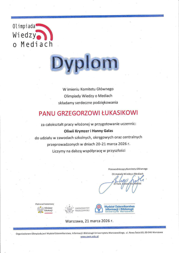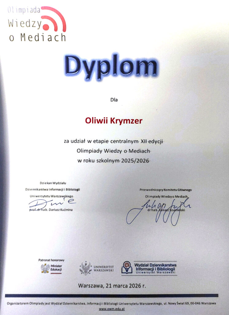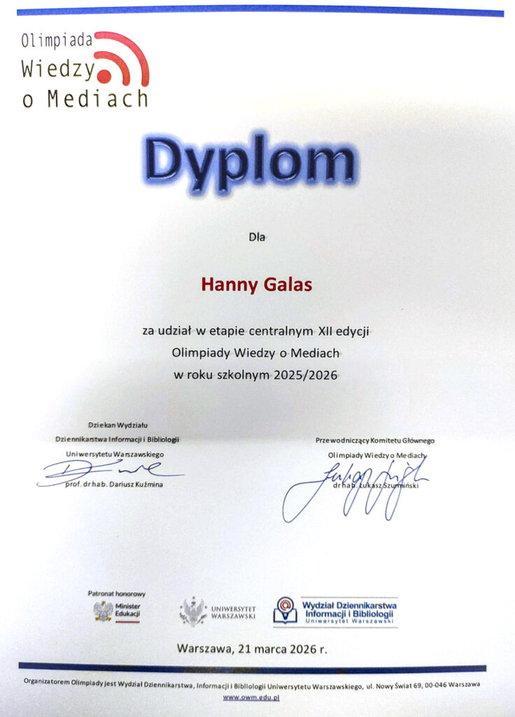 Olimpiada ma charakter interdyscyplinarny i obejmuje m.in. historię mediów, prasy, telewizji i filmu, a także aktualne zagadnienia prawne oraz wiedzę o współczesnych mediach. Wymaga nie tylko wiedzy teoretycznej, lecz także orientacji w bieżących wydarzeniach. Zakwalifikowanie się do etapu centralnego to duży sukces – nasze uczennice znalazły się w gronie najlepszych młodych medioznawców w Polsce, pokonując etap szkolny i okręgowy. To ogromne wyróżnienie i dowód wysokiego poziomu przygotowania naszych uczennic.